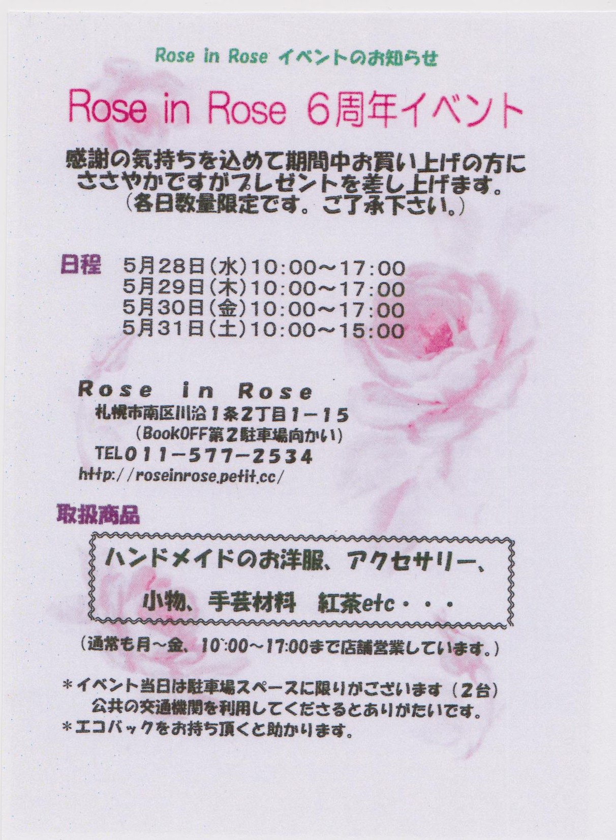 Rose in Roseさんで6周年のイベントが開かれます!