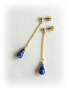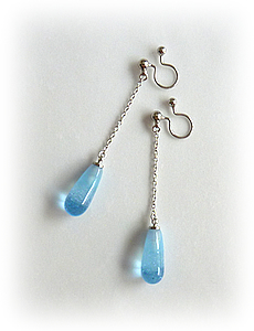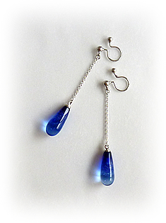 ↑こちらは、不透明の青系マーブルガラスに金箔ラメを重ねた、少し小さめのしずく型ピアスです。