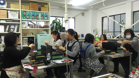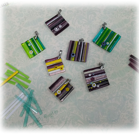 それらの四角引きや薄引きを3cmくらいにカットして並べて、電気炉で焼成、その後形を整えるために研磨し、好みのミルフィオリやパーツを上に乗せて焼成、金具をつけてできあがりです。