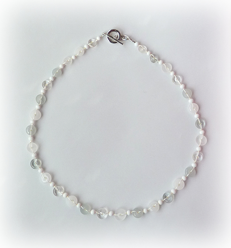 こちらも上の作品同様に様々なビーズを組み合わせています、写真ではわかりにくいのですが、透明のガラスは白透明と薄いグレー透明の2種類あります。