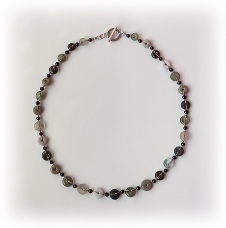 透明、不透明、半透明、すりガラス風、などなど、様々な黒やグレー系のドーナツ型ビーズを組み合わせました。