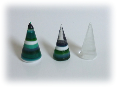 円錐形です、が、左の作品は頂点がつぶれてしまい、真中は配色がイマイチ、一番右の作品も、リングホルダーにしようと(ツリーではなく)制作したのですが、イマイチでした。