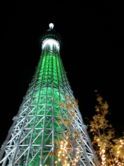 (スカイツリーです、クリスマスツリーのように緑色になっています)