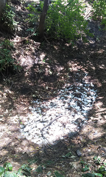 5月半ばというのに、日陰ではまだ雪が残っていました。小川の側なのと、急な崖のようになっているのとで、解けにくいようです。↓