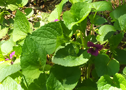 スミレも沢山咲いています、薄紫色や青紫色が多い中、なんと、赤紫色の花をつけているものもありました!↓