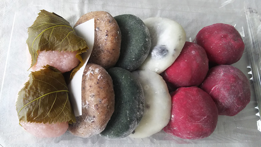 左から、桜餅、クルミ餅、草餅、豆餅、イチゴ大福です。