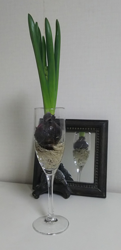 お花屋さんの福袋があるというので、気になって見に行ったところ、福袋は買わなかったのですが、ヒヤシンスの球根(すでに芽がでているもの)があり、思わず一つ買ってしまいました。